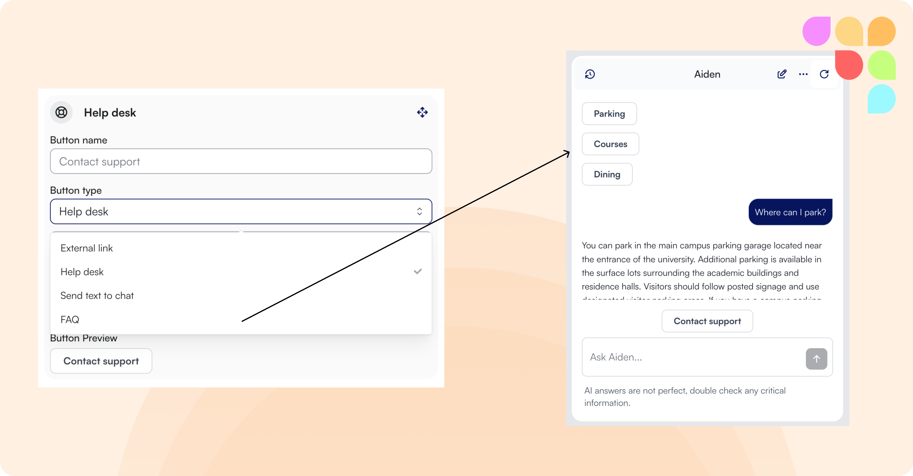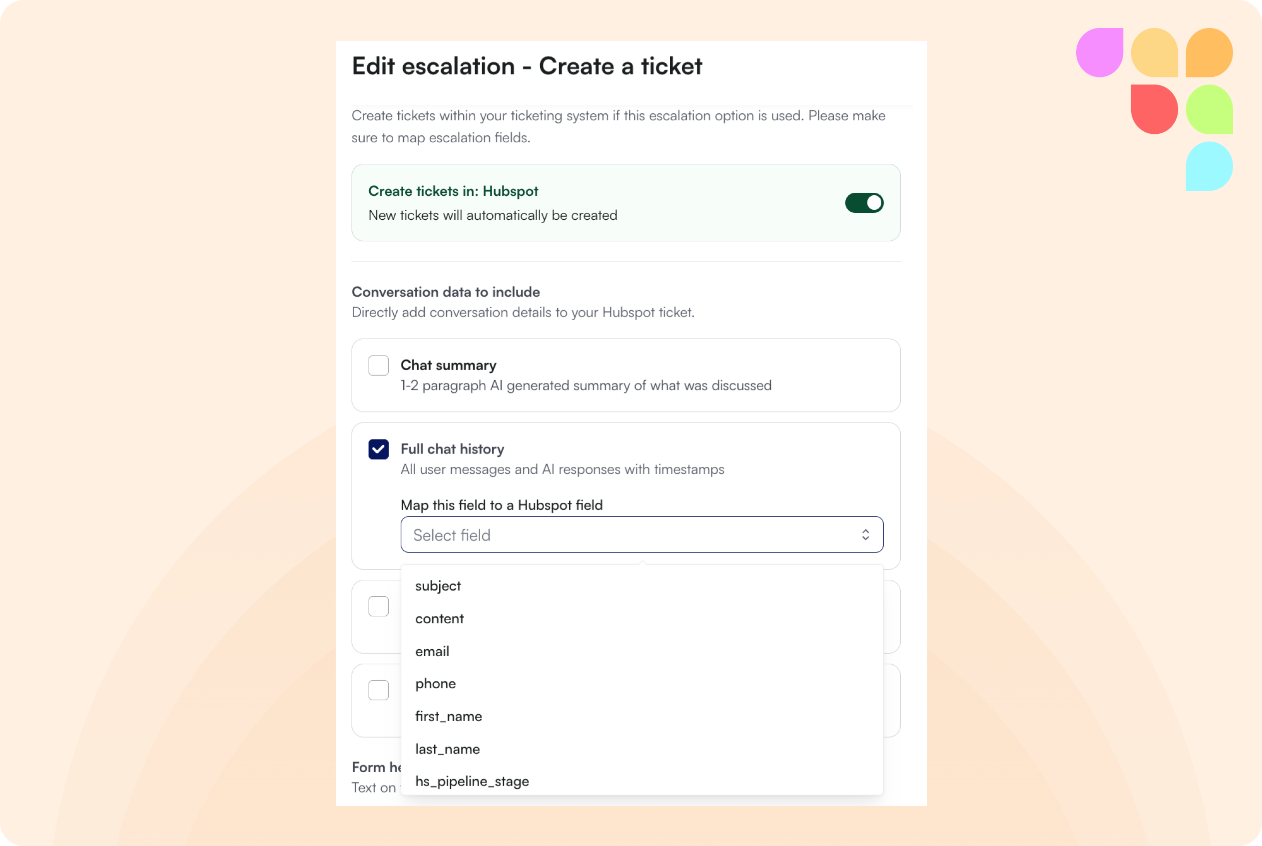 When escalating to a Help Desk, admins can now choose to push specific parts of the conversation into ticket fields, including a chat summary, full conversation history, and individual pieces of user metadata (e.g. name, email).