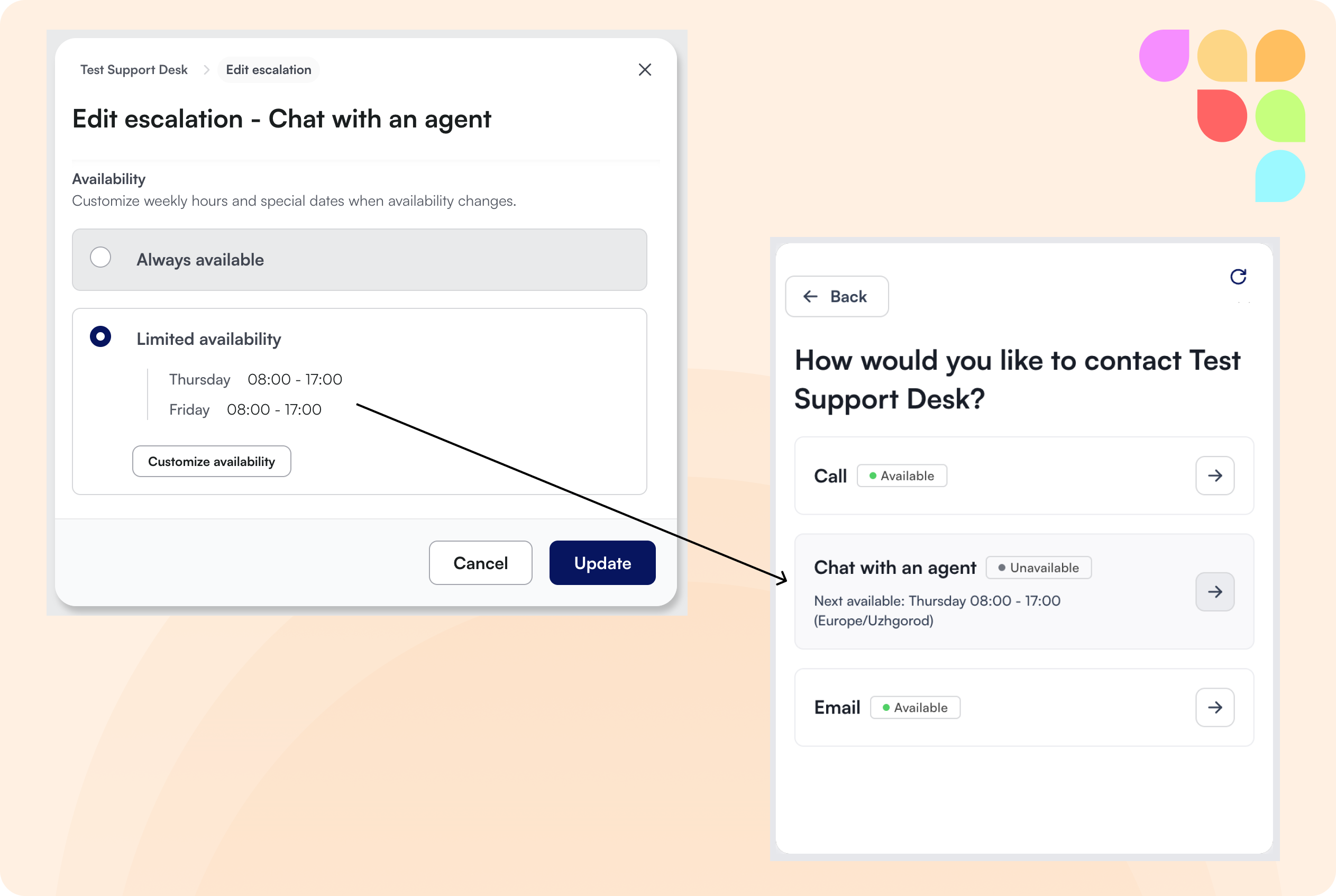 Escalation options now show when support is available. If currently closed, users see the next available day and time, helping them know when to expect help.