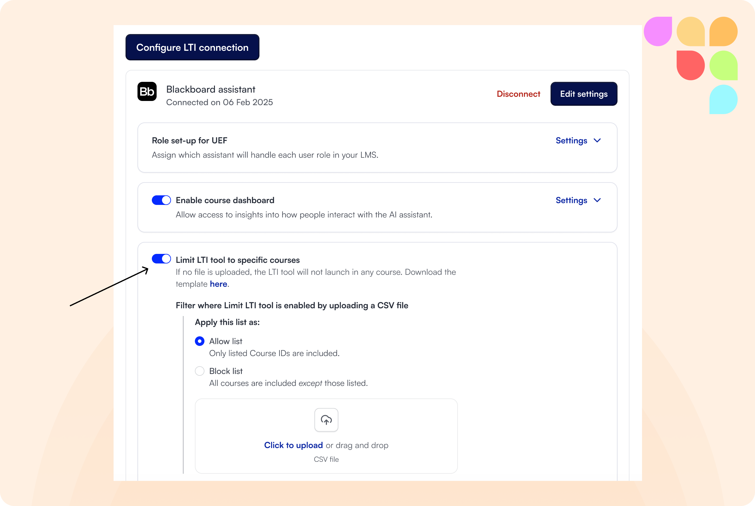 Control which courses can access your assistant through LTI by uploading a CSV of allowed or blocked course IDs. This enables controlled pilot rollouts to specific courses without managing individual LTI placements. Particularly useful for Blackboard UEF integrations where placement control is limited.