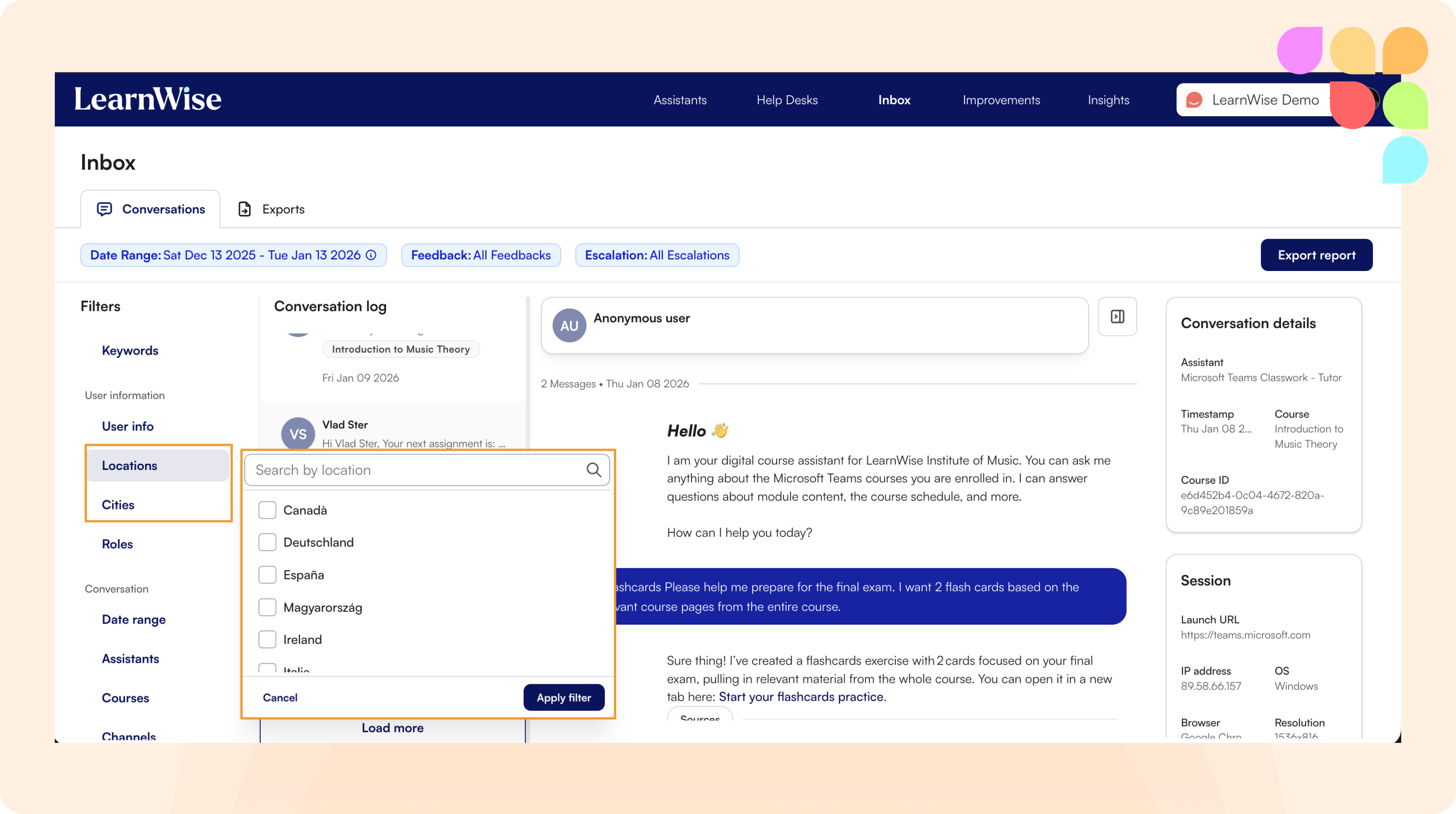 The system now displays general location information (country and city) in the inbox, helping you better understand the geographic distribution of your students and provide more contextually relevant support.
