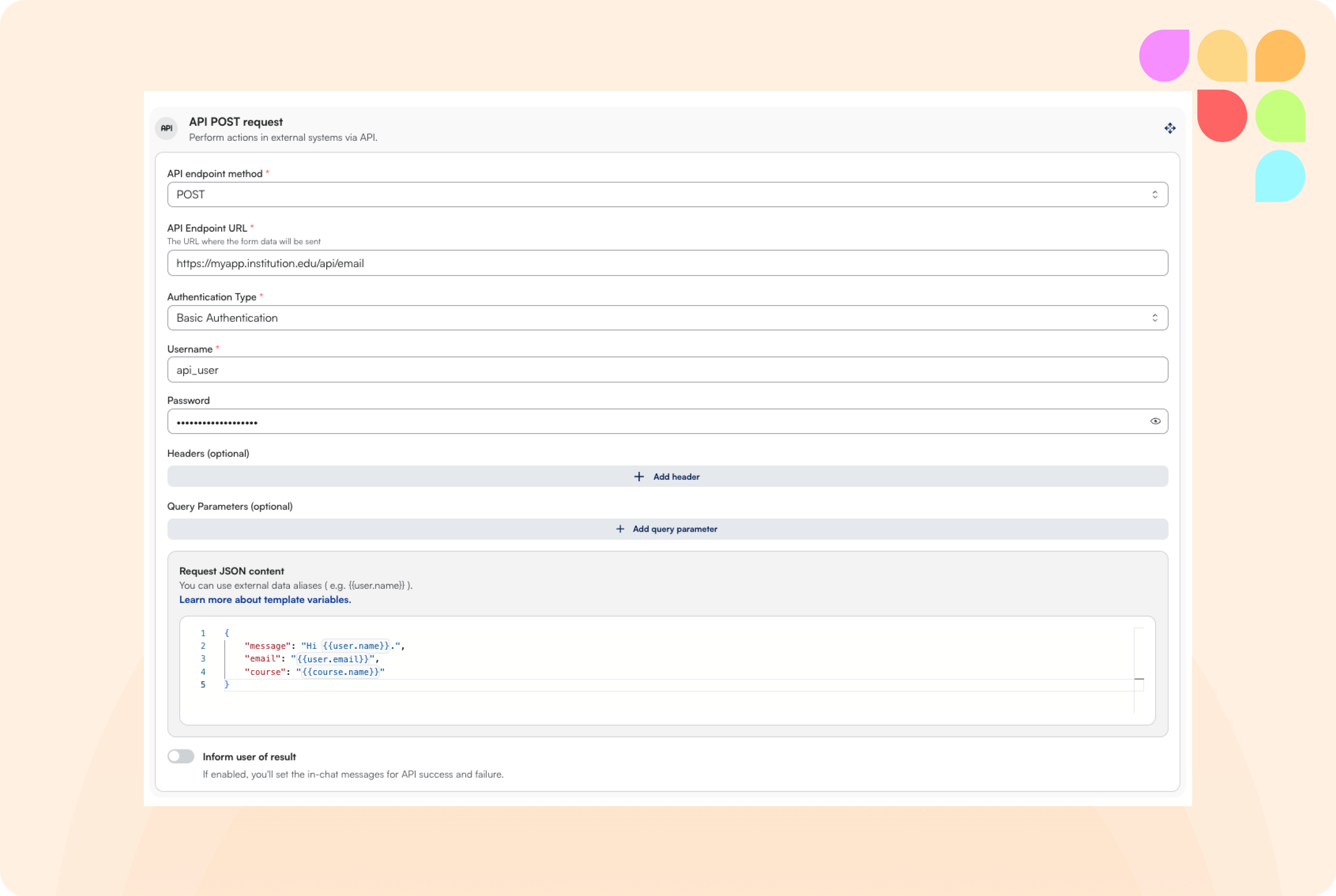 Configure API POST requests directly within Help Desks and Flows to integrate with external systems (e.g., SIS, CRM, and automation tools). Supports multiple authentication methods (API Key, Bearer token, JWT Bearer, Basic Auth) and dynamic variables like user information and conversation data.