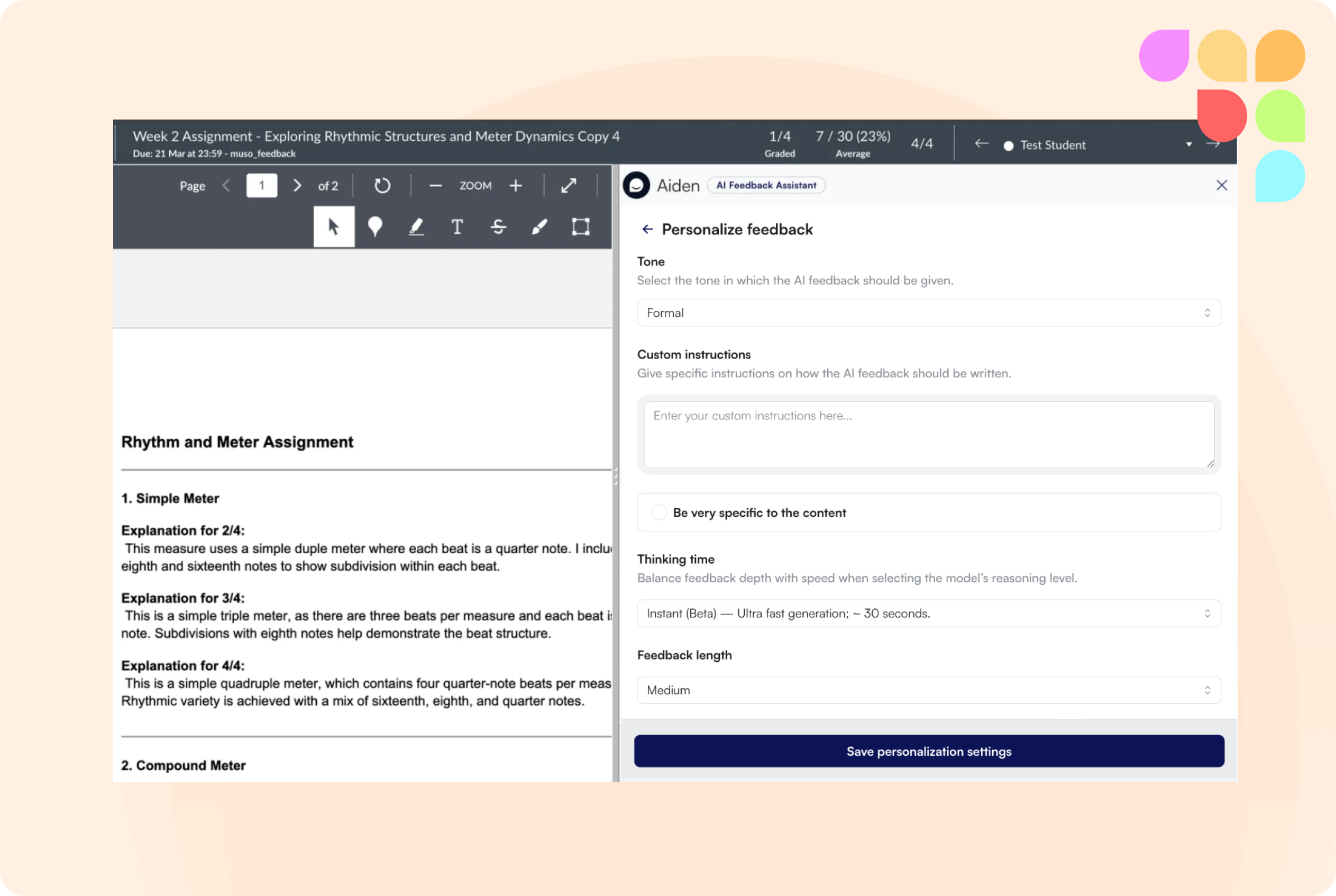 The feedback pipeline has been rebuilt from the ground up. The AI now analyses each part of a submission individually, producing more specific feedback and more accurate grading suggestions. Generation is faster on average, as the tool starts preparing in the background before the teacher opens it. Teachers set their personalization preferences once on first launch and they apply to all future sessions. Video and multi-file submissions are now supported.