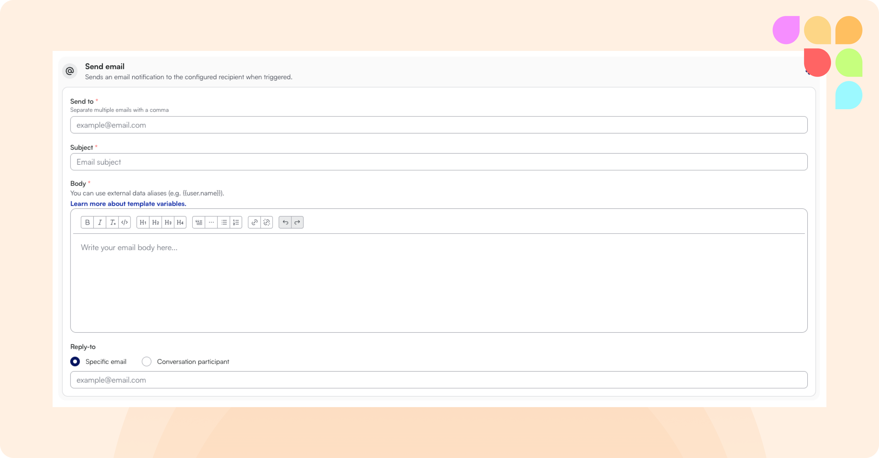 A new workflow action that automatically sends an email when a workflow is triggered, no API setup required. Admins configure the recipient, subject, and body, and can insert dynamic fields like the user's name, email, course name, and course ID. Useful for scenarios like student-at-risk alerts, where a counsellor or staff member needs to be notified when a student flags they're struggling.