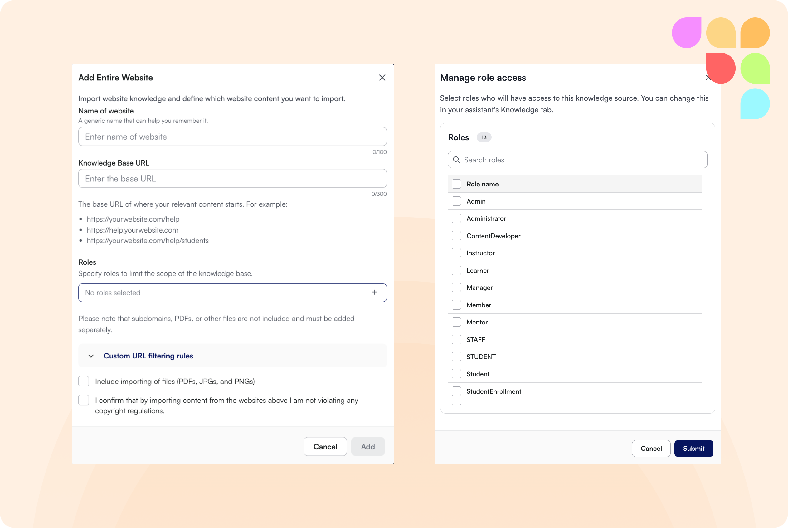 Restrict specific knowledge sources to certain user roles in websites, applications, and files. When users authenticate, they only see content relevant to their role. For example, restrict instructor-facing ServiceNow articles to faculty while keeping student support articles visible to everyone.