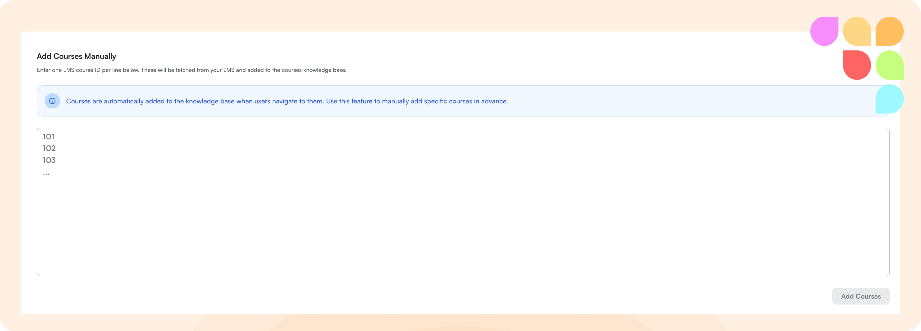 Admins can now manually add LMS courses by ID, allowing course content to be fetched in advance before students access the assistant. This eliminates the 2-15 minute wait when students first open the LTI or cross-course chat, ensuring tutoring content is ready immediately.