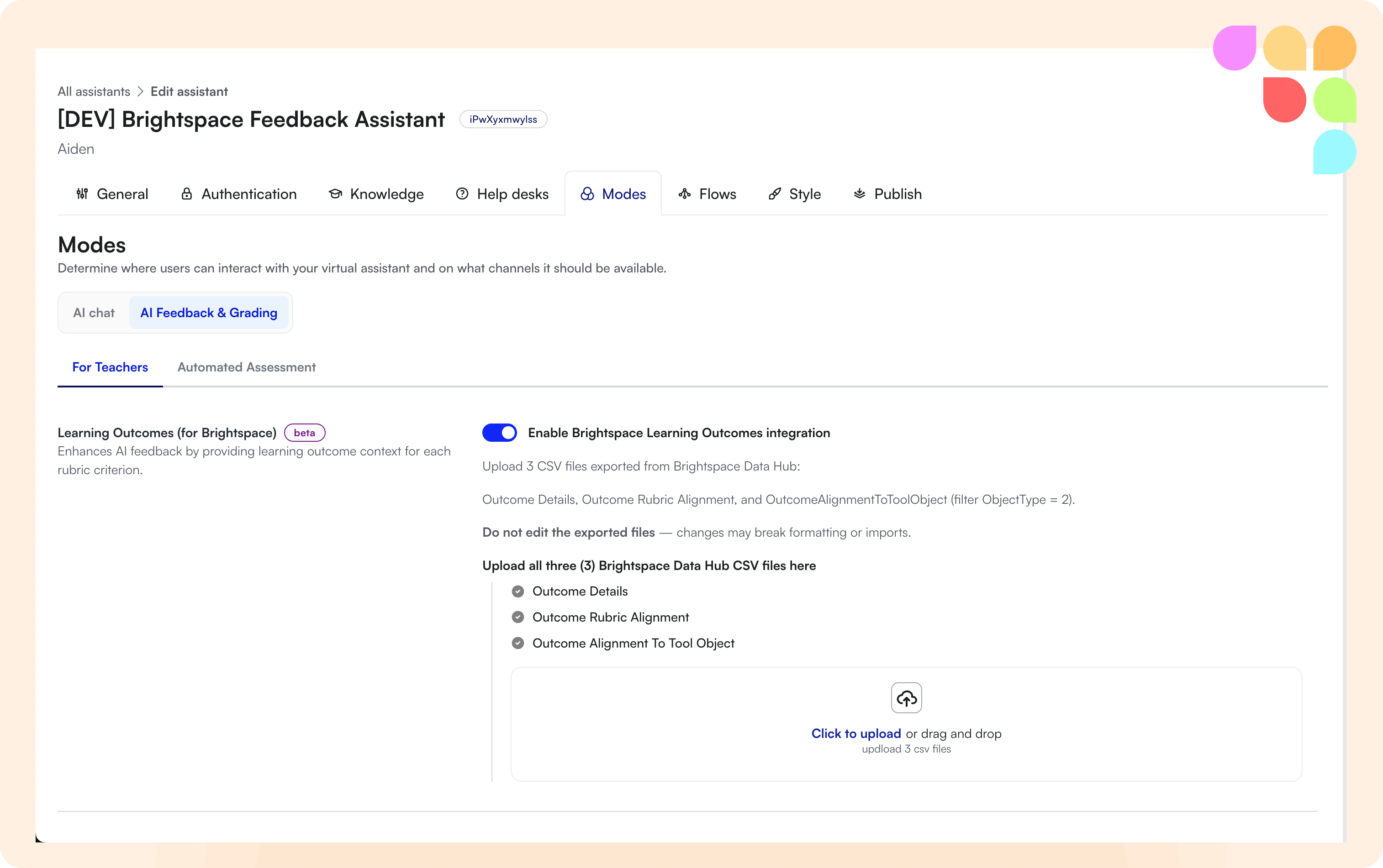 You can now upload and integrate Course Learning Outcomes from Brightspace into your AI Feedback pipeline. The system automatically maps outcomes to rubric criteria and provides outcome-aligned feedback to students, helping ensure assessments stay connected to course objectives.