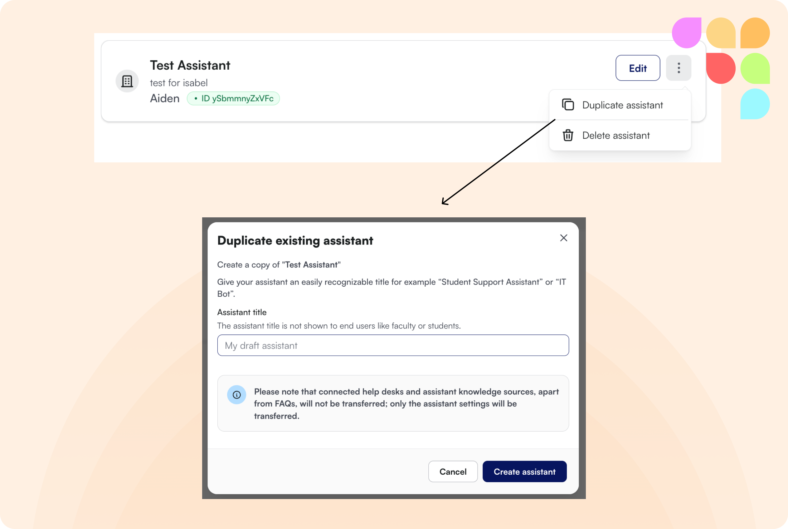 Admins can now duplicate an existing assistant from the All Assistants screen. General settings, styles, flows, and FAQs are copied to the new assistant. Note that knowledge sources and help desks are not copied at this stage.