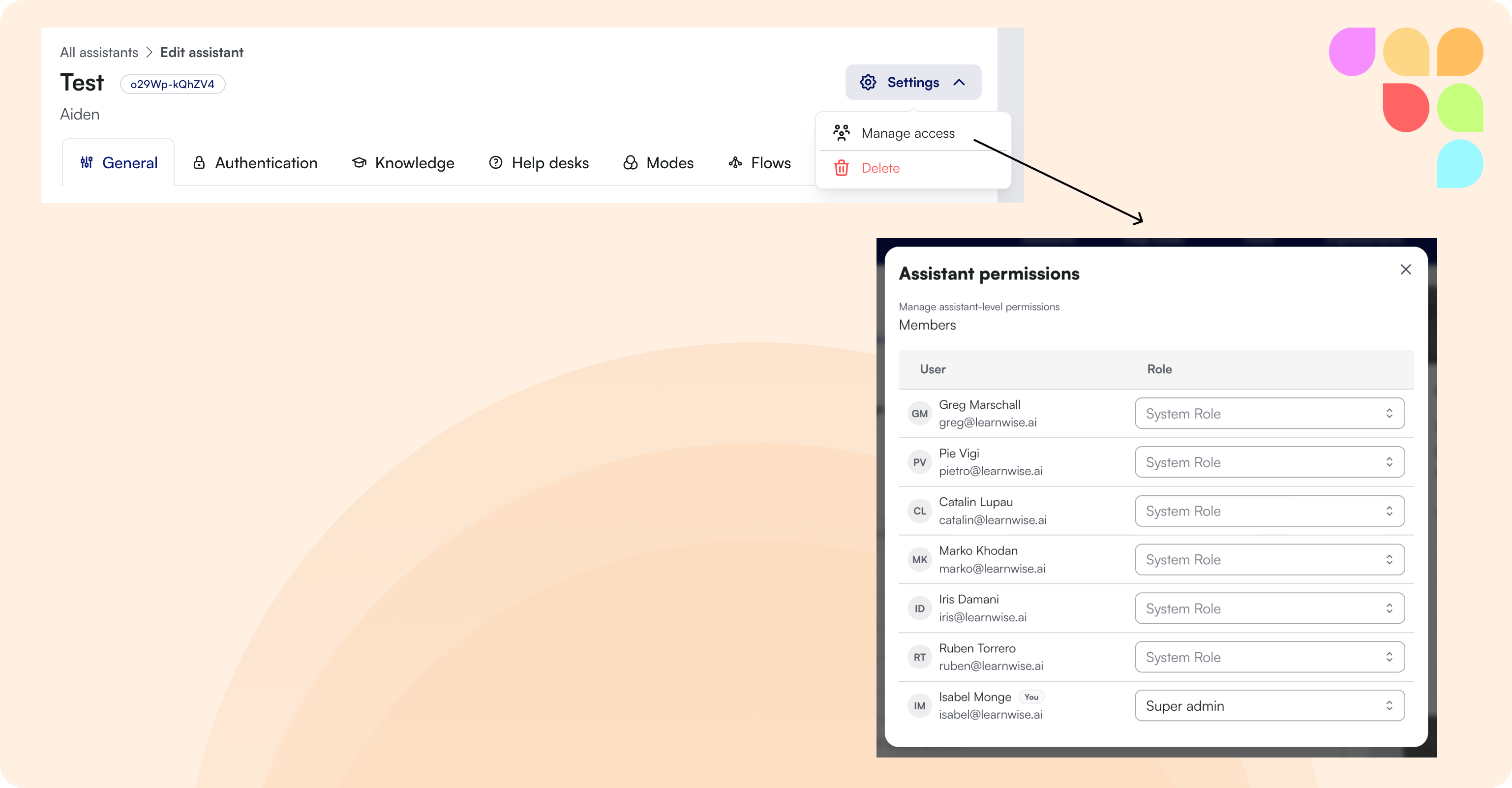 Admins can now be assigned permissions on a per-assistant basis, rather than only at the organization level. This lets institutions give specific staff access to manage individual assistants, for example different departments or teams managing their own assistants independently, without granting org-wide access.