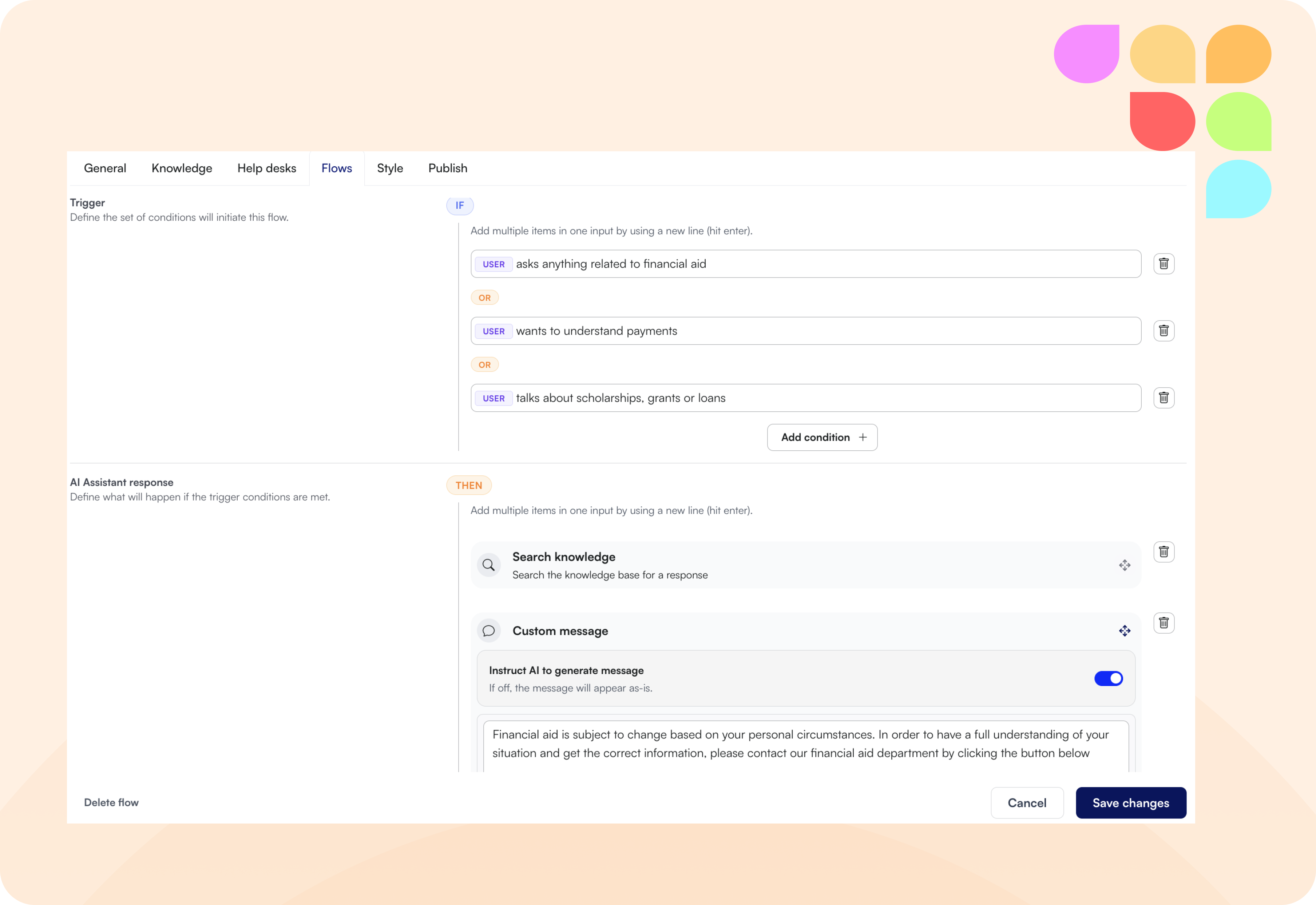 Flows in LearnWise let you define clear response pathways based on user inquiries, ensuring optimal handling of every scenario. Easily determine whether a knowledge search occurs, the user is escalated directly to a helpdesk, tailored follow-up questions are presented, or a custom message is delivered.