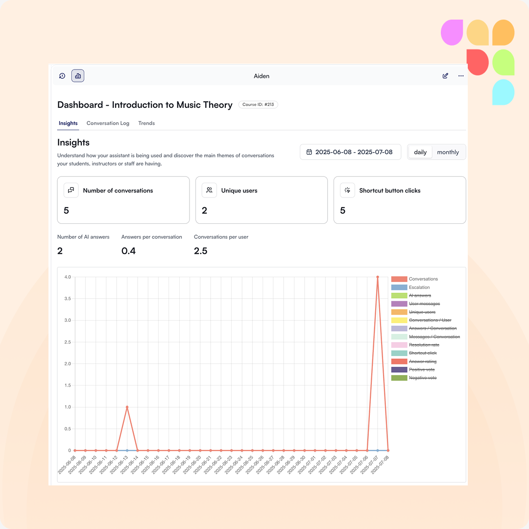 Instructors can now access a dedicated dashboard that provides visibility into how their course content is being used within the AI assistant. This enables data-informed decisions and targeted course improvements. Admins control what’s shared with teachers at the course level—giving teams both flexibility and actionable insight to enhance learning and student experience.