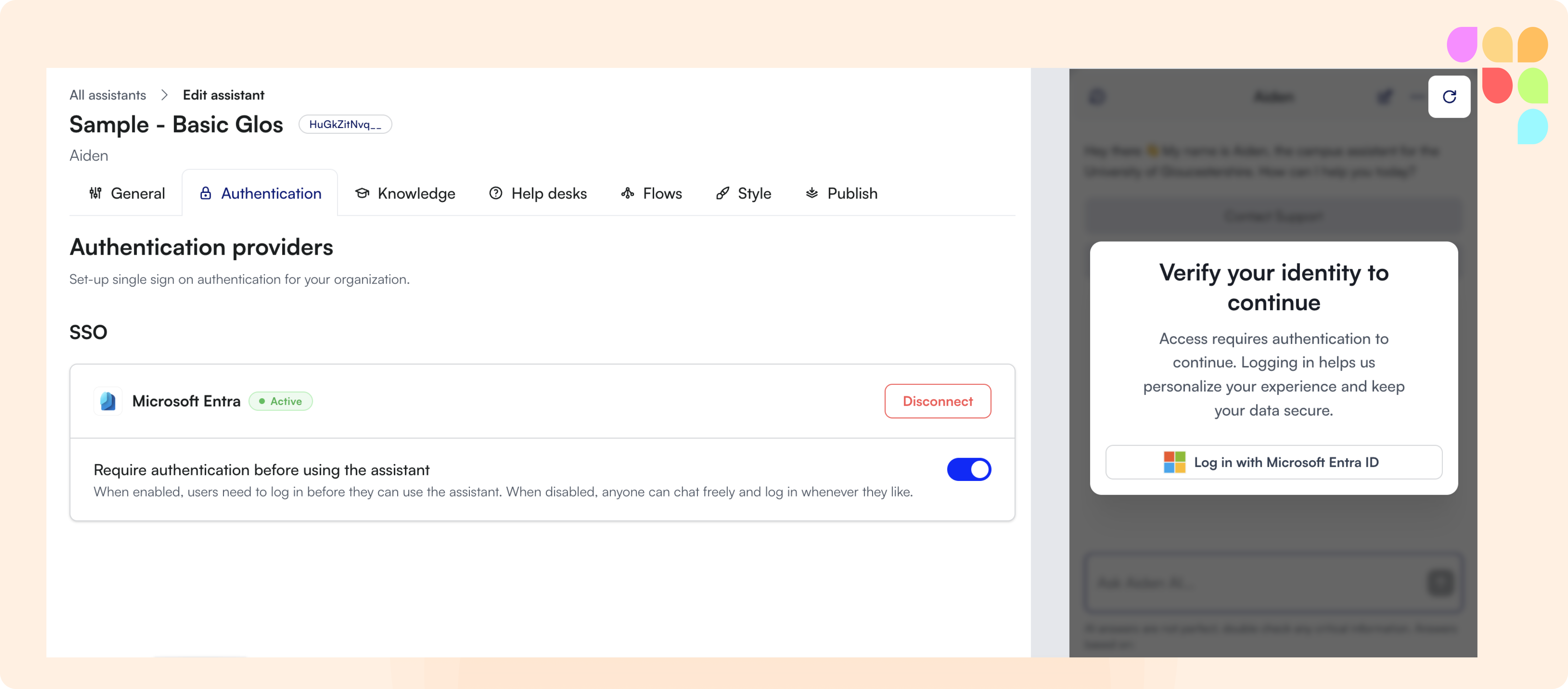 We've introduced contextual icons to key sub-tabs—General, Authentication, Knowledge, Help Desks, Flows, Style, and Publish. These visual cues enhance navigation by making each section instantly recognizable, streamlining user experience and reducing time-to-action.