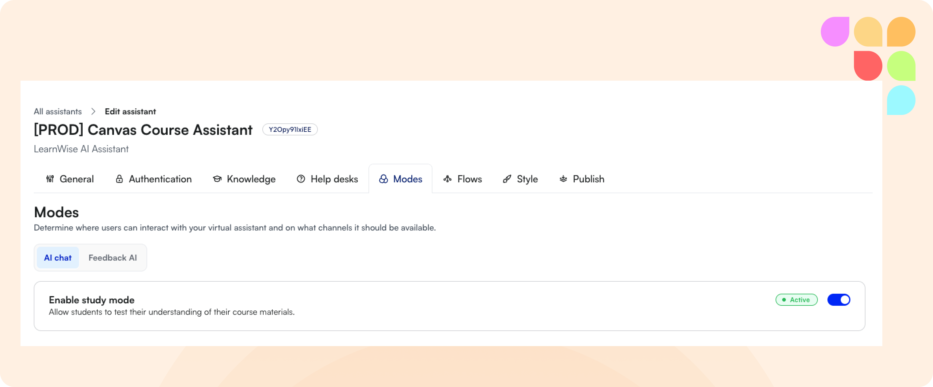 You can now easily enable or disable Study Mode for the Course Assistant and Feedback Mode for the Feedback Assistant directly from your admin dashboard. This removes the need to manage client IDs, keys, or secrets, giving you faster setup and greater control over which modes are applied.