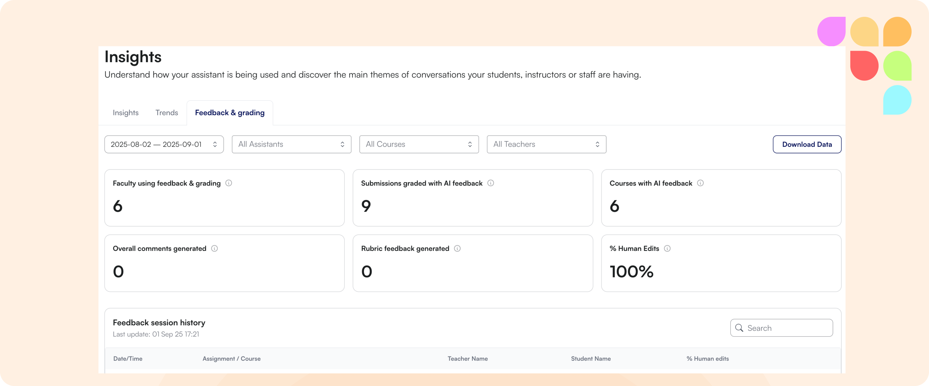 Institutions using LearnWise’s feedback and grading tool now gain access to detailed insights on how faculty are leveraging it. These insights cover faculty usage, submissions graded, human edits, session history, and more—all exportable for easier analysis and reporting.