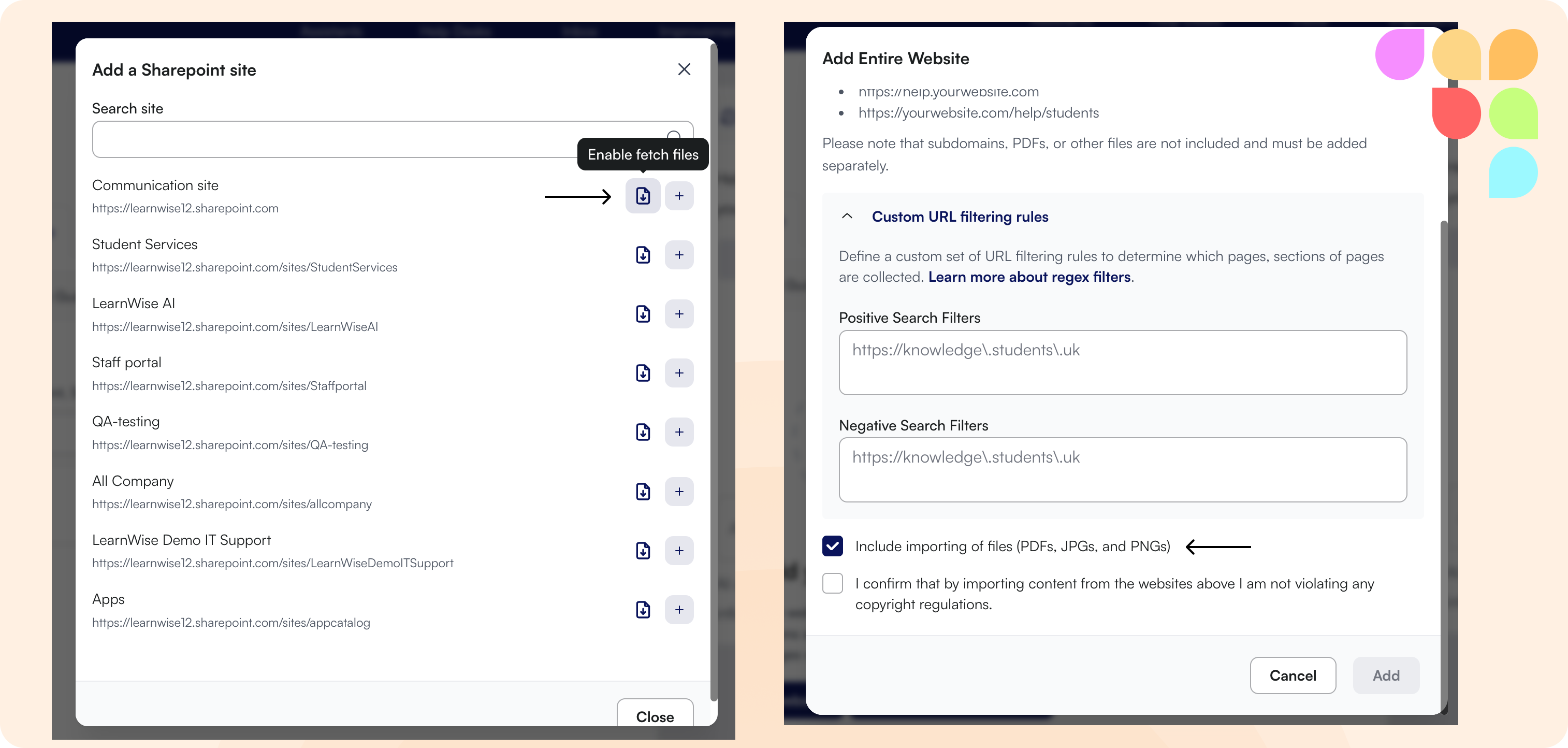 You can now retrieve files linked within knowledge articles from integrations like SharePoint, ServiceNow, Salesforce, websites, and webpages. When adding or managing knowledge sources, toggle "Fetch Files" to automatically include linked documents, PDFs, and other files alongside the main content. This ensures your assistant has access to complete information from your knowledge base.